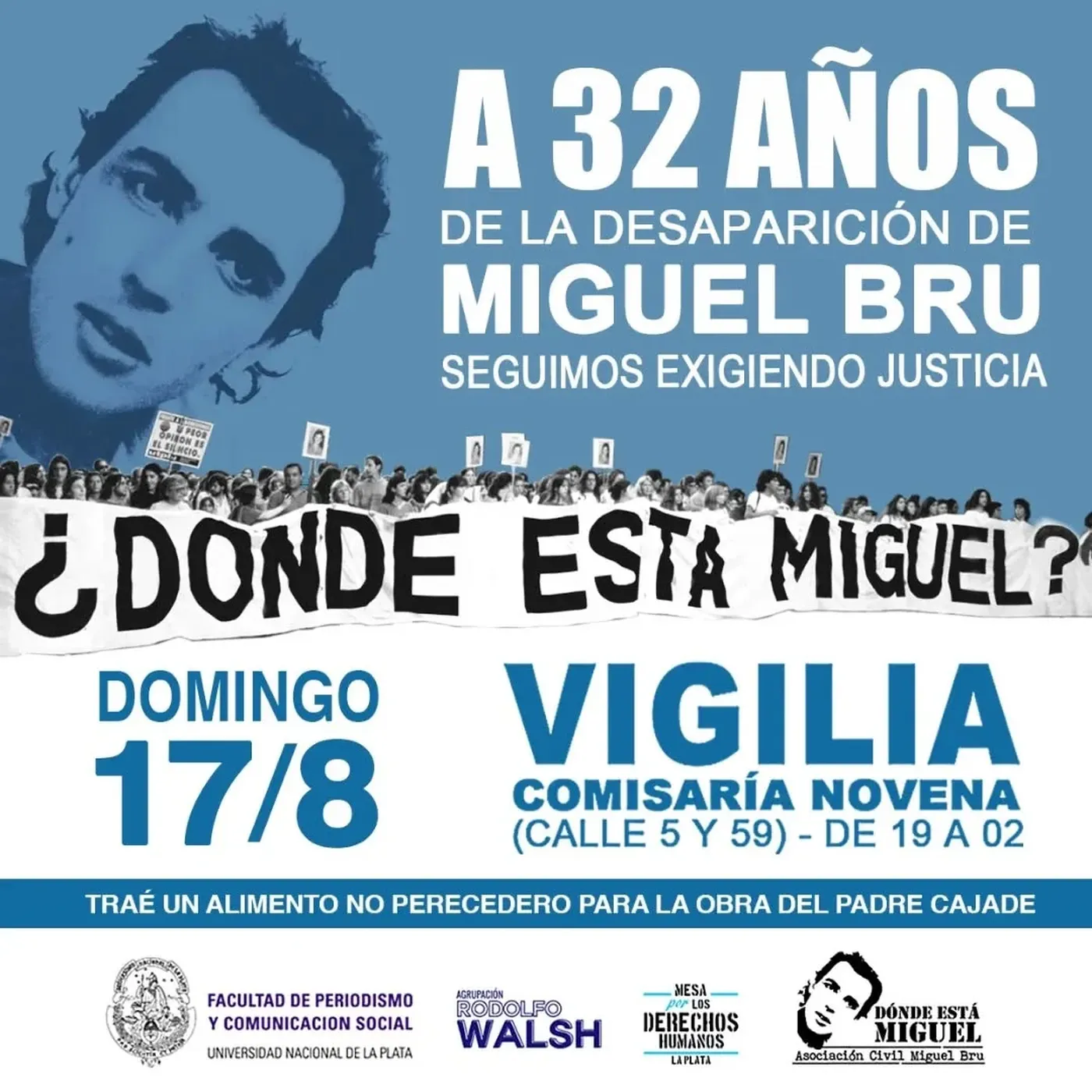 Familiares y amigos de Miguel Bru realizan una vigilia este domingo a 32 años de su detención y desaparición en La Plata. Será frente a la Comisaría Novena, ubicada en 5 y 59.