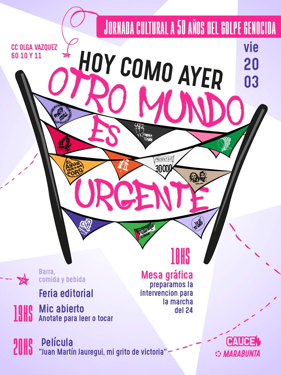 La propuesta es organizada por los espacios culturales Cauce y Marabunta, acompañada por la Asociación Civil Casa Histórica y Cultural Juan Martin Jauregui y busca combinar memoria, arte y participación colectiva en la antesala de una nueva conmemoración del Día Nacional de la Memoria por la Verdad y la Justicia.