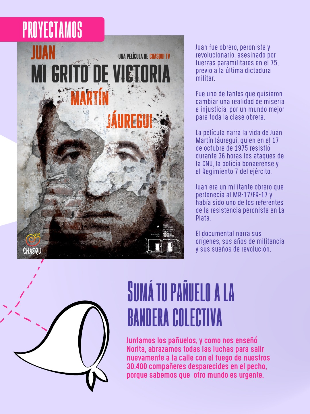 Más tarde, a las 20, se proyectará el documental “Juan Martín Jáuregui, mi grito de victoria”, una producción de Chasqui TV que reconstruye la historia del militante obrero Juan Martín Jáuregui.