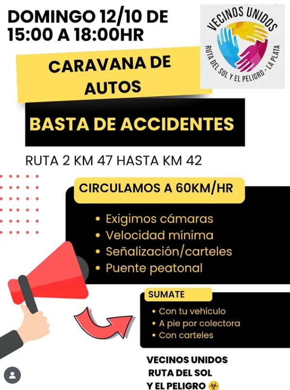 La convocatoria, organizada por el grupo Vecinos Unidos Ruta del Sol y el Peligro, se realizará el domingo 12 de octubre, de 15 a 18 hs, que incluirá una caravana de autos en la Ruta 2 entre el kilómetro 47 y el kilómetro 42, a una velocidad máxima de 60 km/h.