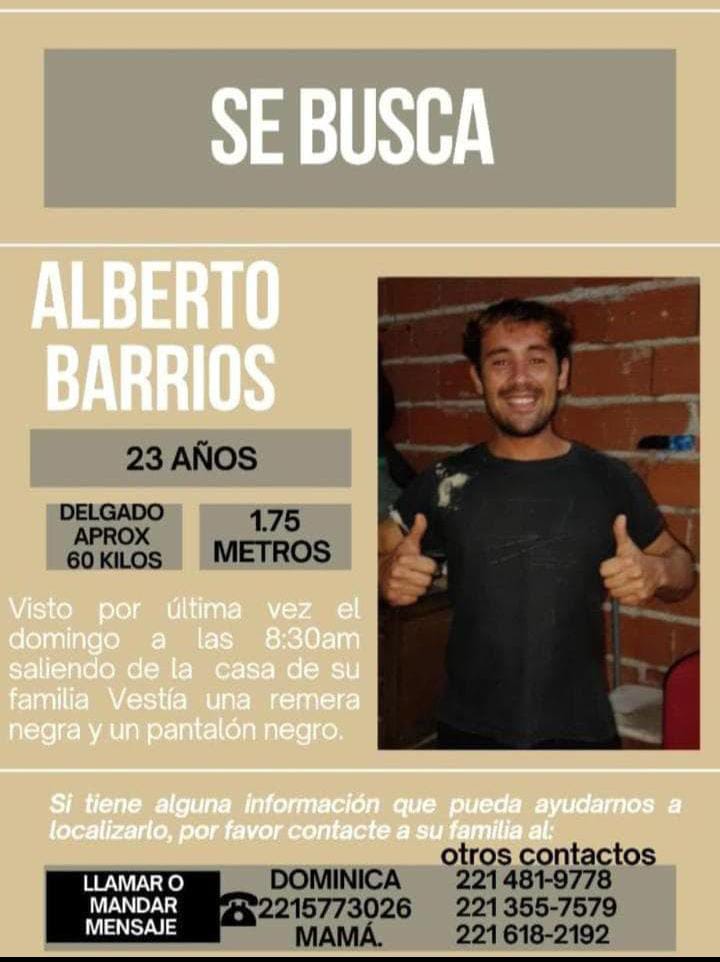 Familiares y amigos solicitan colaboración para dar con el paradero de Alberto Barrios, argentino de 23 años, domiciliado en Melchor Romero.