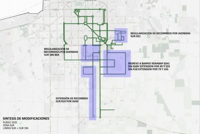 Sur: suma de conexiones en sectores densamente poblados, extensión por avenida 60 hasta Ruta 36 y cambios en la línea 506 (5%).