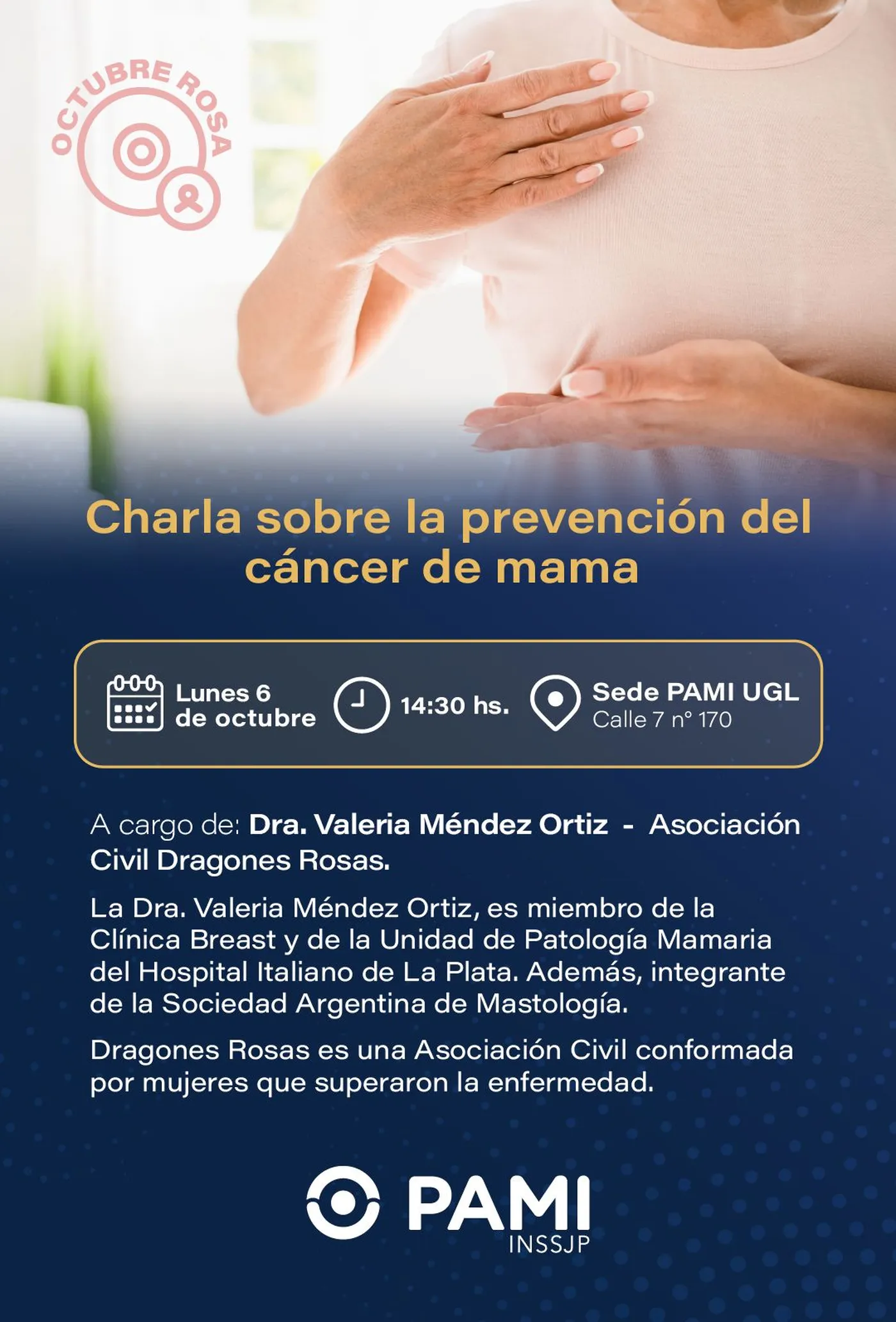 PAMI La Plata anunció que realizará una charla sobre la concientización sobre el cáncer de mama, la misma será abierta y gratuita para toda la comunidad. Será en el marco del Mes de Sensibilización sobre el Cáncer de Mama (Octubre Rosa).