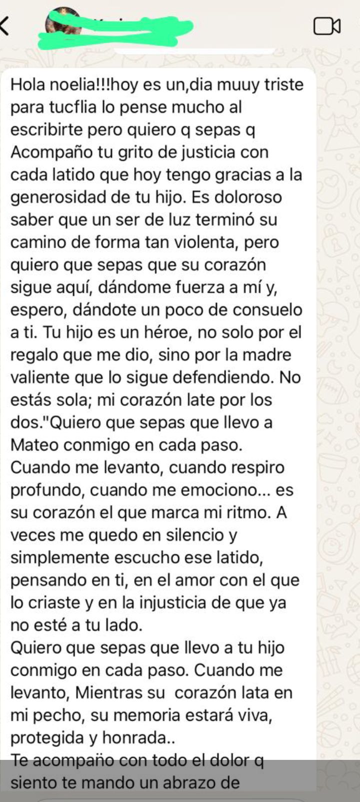 “Mientras su corazón lata en mi pecho, su memoria estará viva, protegida y honrada”, cerró Karina, en un emocionante mensaje por whatsapp que envió a Noelia, madre de Mateo.