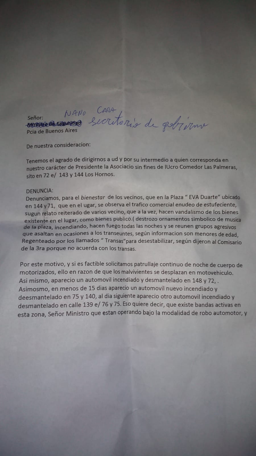 En las ultimas horas, desde el Comedor Barrio “Las Palmeras” ubicado en 72 entre 143 y 144, de Los Hornos, enviaron una nota dirigida al municipio pidiendo mayor seguridad en el barrio. En el escrito, denuncian: venta de droga, vandalismo y robos.