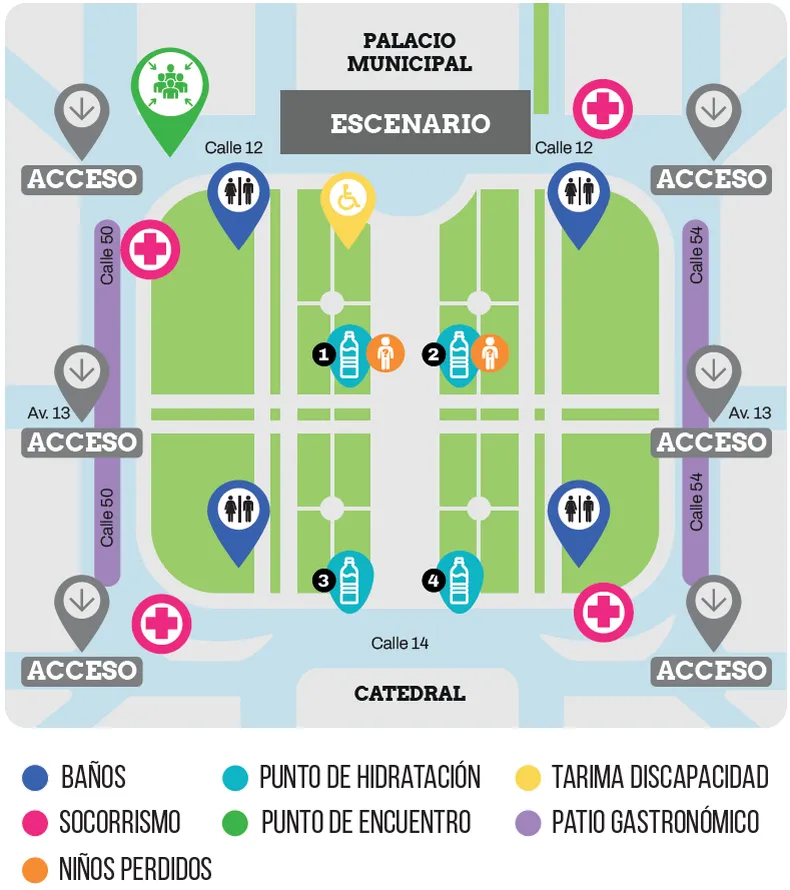 Para familias y personas extraviadas habrá un punto de referencia en 12 y 50, además de puestos de asistencia médica en 12 y 54; 14 y 54; 14 y 50; y 12 y 50. También se instalarán baños químicos en calles 50 y 54, y un sector accesible en 12 y 51. Los corredores gastronómicos funcionarán sobre 50 y 54, entre 12 y 14.