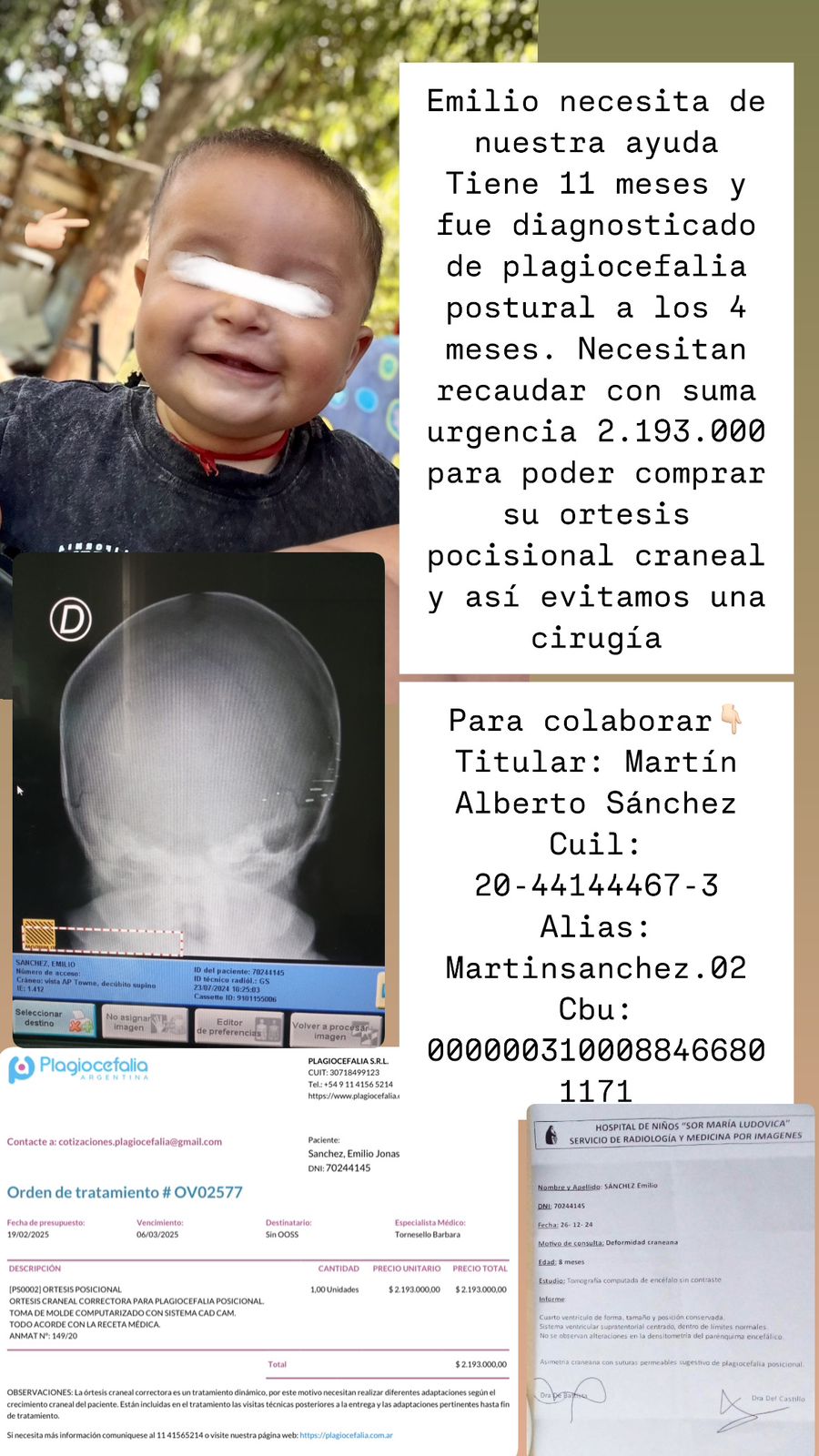 Emilio tiene 11 meses, fue diagnosticado con plagiocefalia postural y piden ayuda para su tratamiento