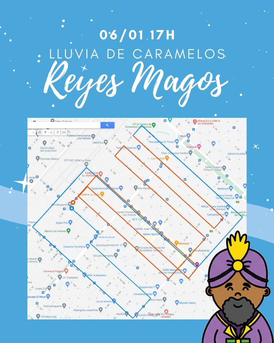 El punto de partida de los reyes será a las 17 hs desde la Iglesia San Benjamín de la calle 57 y 140. Finalizará alrededor de las 20 hs en el mismo lugar.