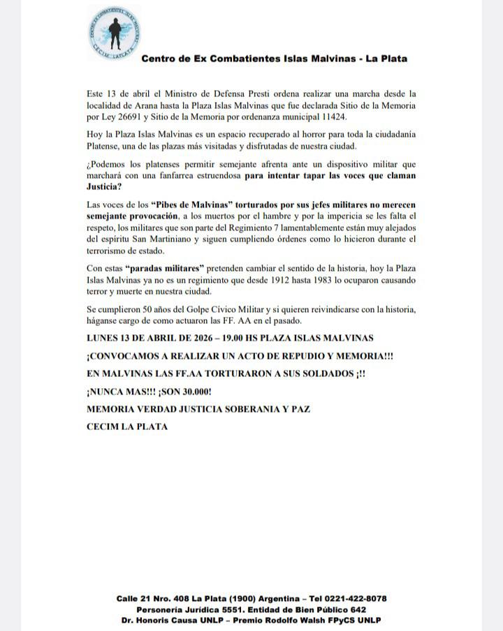 En respuesta, el CECIM convocó a un “acto de repudio y memoria” para el mismo lunes a las 19 en la esquina de 19 y 51. La movilización buscará recordar a los 36 platenses caídos en el conflicto y denunciar las torturas que, según sostienen, sufrieron soldados durante la guerra. El comunicado concluye reafirmando las consignas de Memoria, Verdad, Justicia, Soberanía y Paz.