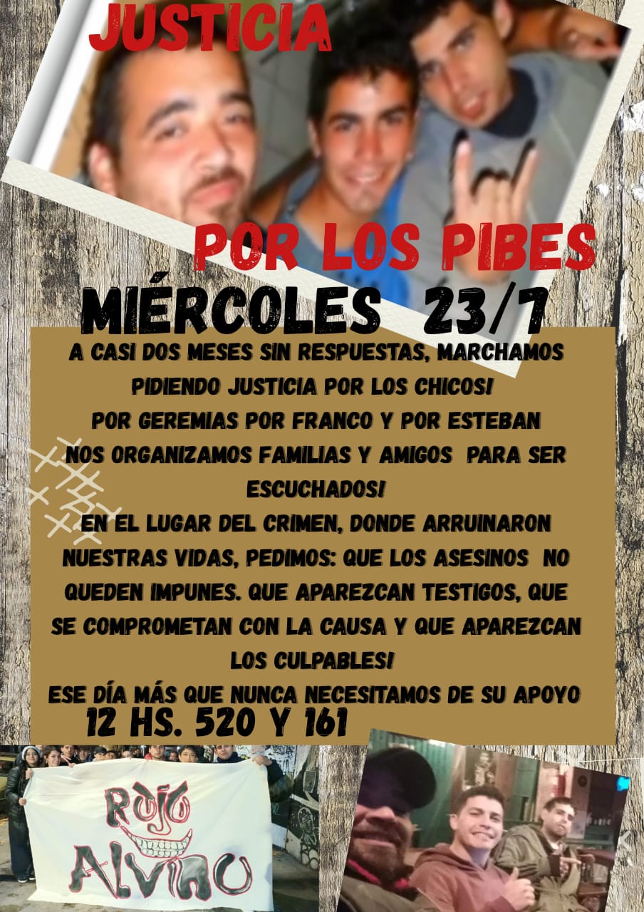 Familiares, amigos y allegados de Axel Geremías Martínez, Franco Giampieri y Esteban Acosta, los jóvenes atropellados en Romero, se movilizarán el próximo miércoles a las 12 h en 520 y 161 para pedir justicia.