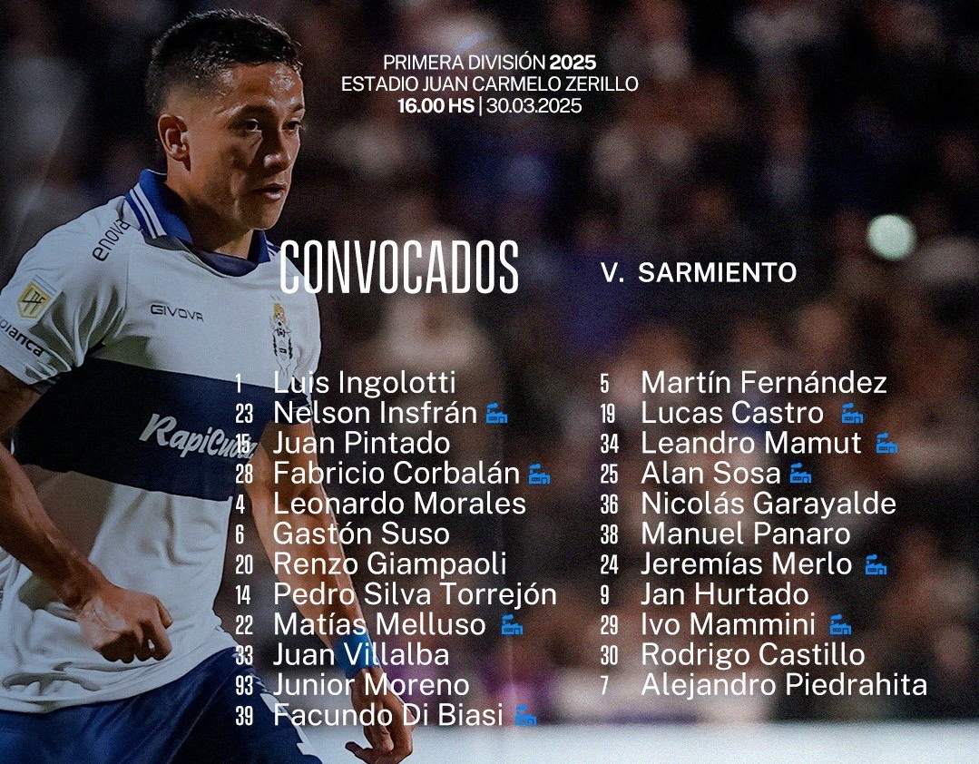 SARMIENTO: Lucas Acosta; Renzo Orihuela, Facundo Roncaglia, Juan Manuel Insaurralde, Gabriel Díaz ó Joel Godoy; Joaquín Gho ó Leandro Shur, Carlos Villalba, Elián Giménez, Valentín Burgos; Gabriel Carabajal ó Pablo Magnín; Iván Morales Bravo. DT: Javier Sanguinetti.