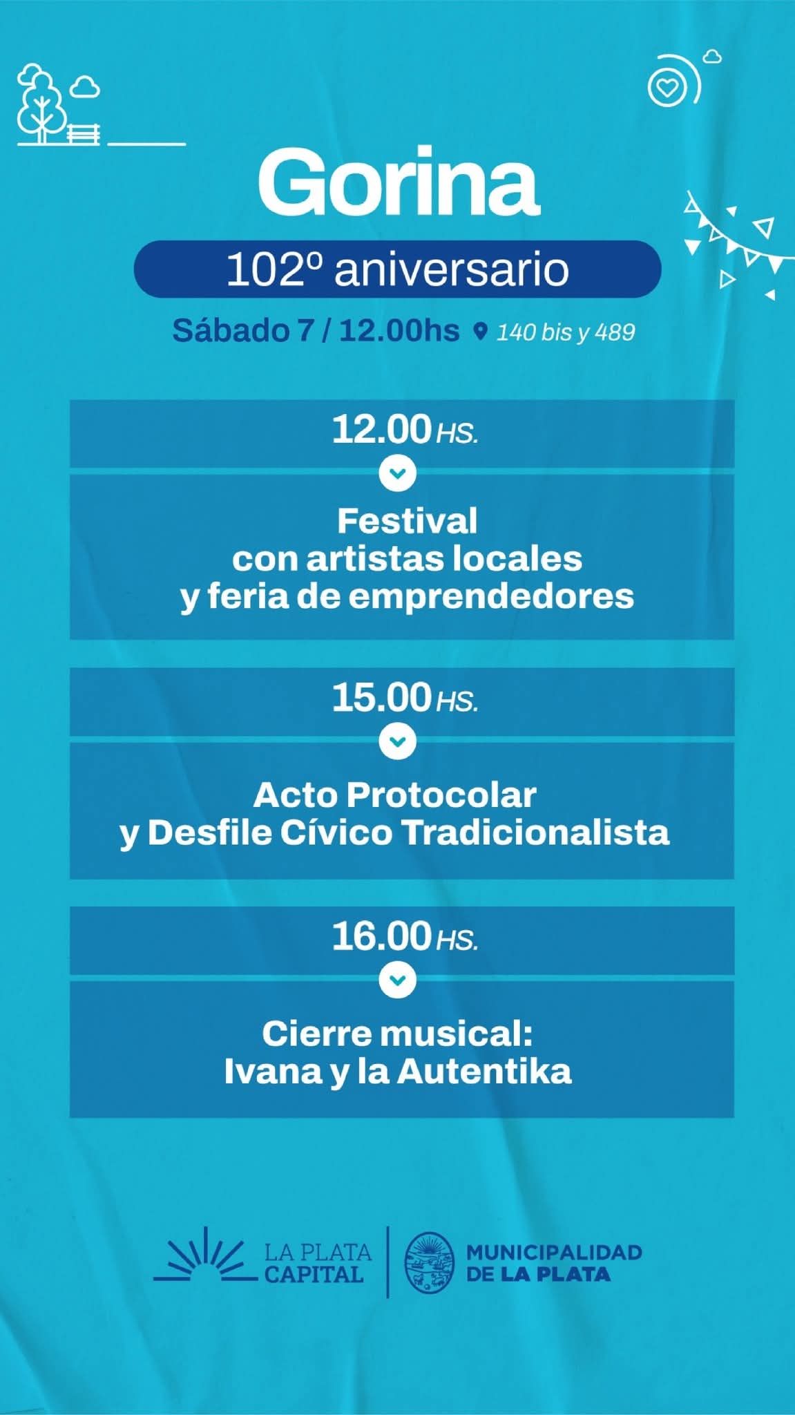 Gorina festejará su 102 aniversario este sábado 7 de junio y los vecinos podrán disfrutar de un desfile cívico-tradicionalista, un acto protocolar y un festival con la participación de artistas locales y emprendedores de la zona. La celebración comenzará a las 12 hs.