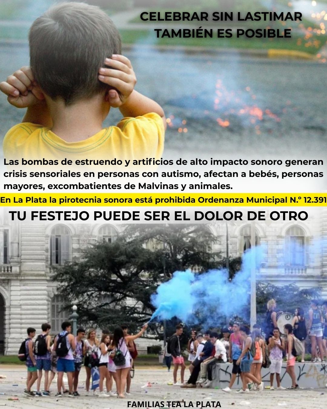 Familias y organizaciones de la ciudad de La Plata impulsan una campaña para exigir el cumplimiento efectivo de la ordenanza municipal que prohíbe el uso de pirotecnia de alto impacto sonoro.