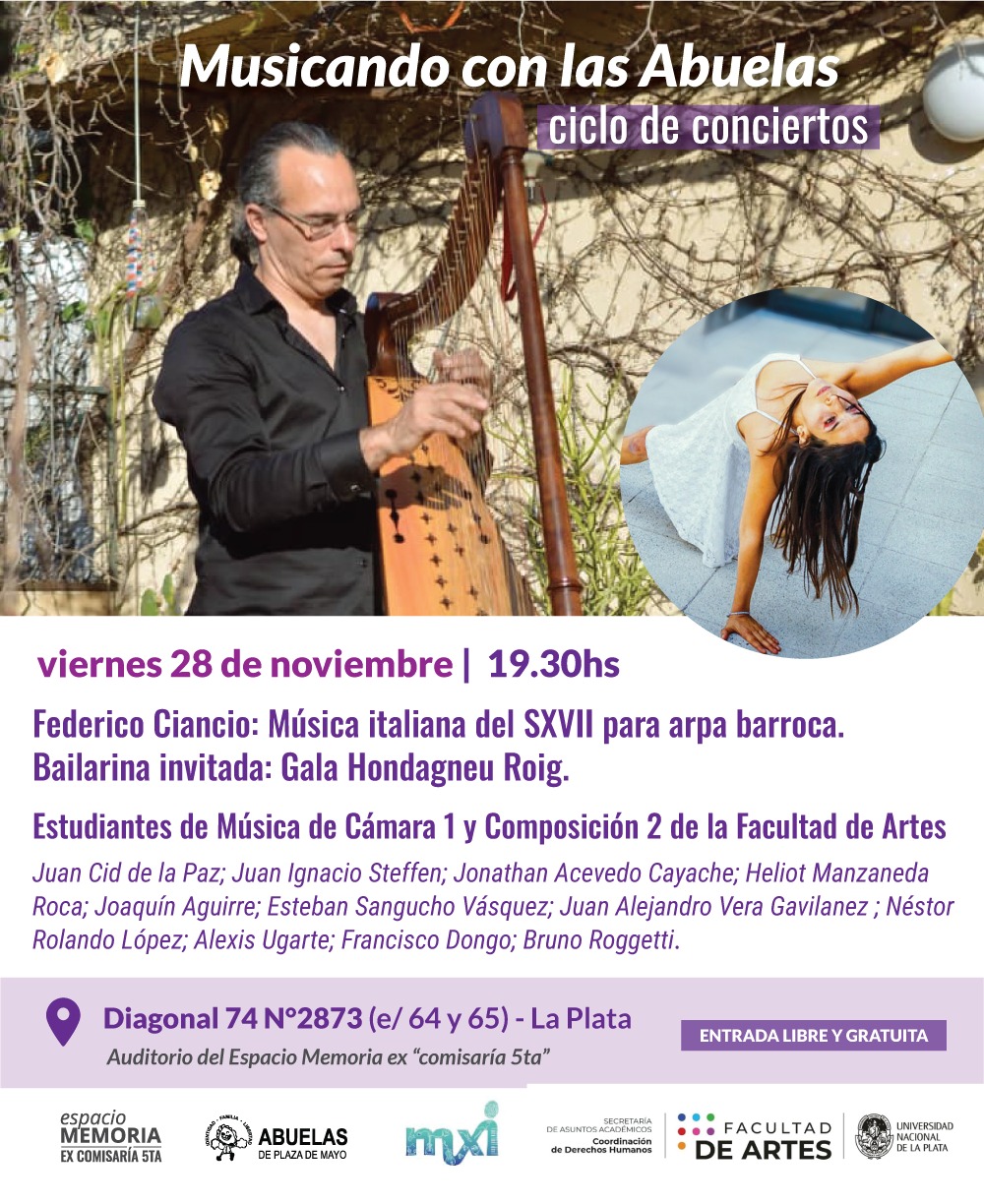 Este viernes 28 de noviembre a las 19:30 se realizará el último encuentro gratuito del ciclo “Musicando con las Abuelas” en el Auditorio del Espacio Memoria, ubicado en la ex Comisaría 5ta (Diagonal 74 N° 2873 entre 64 y 65).