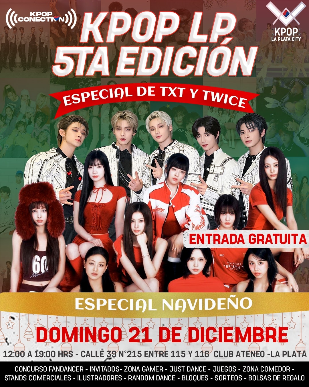 La comunidad Kpop La Plata City anunció la quinta edición del año con un especial navideño dedicado a los grupos TXT y TWICE. Se realizará el domingo 21 de diciembre, de 12 a 19 hs, en el Club Ateneo ubicado en calle 39 N° 215 entre 115 y 116. La entrada será gratuita.