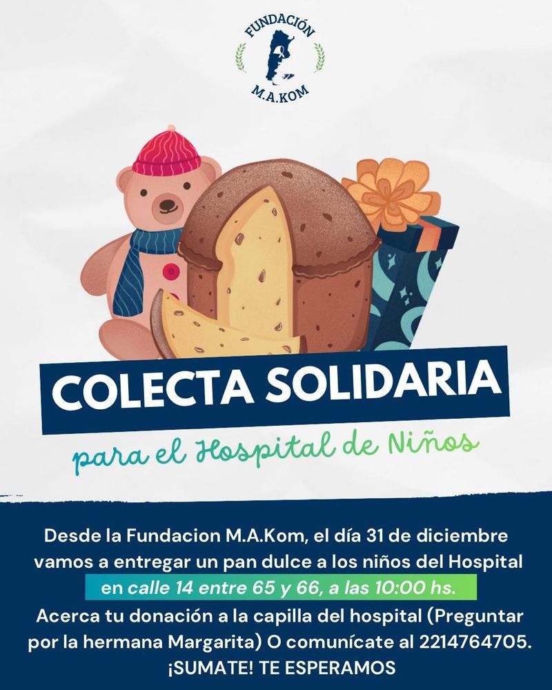 La Fundación M.A.Kom lanzó una colecta solidaria para los niños que se encuentran internados en el Hospital de Niños. La iniciativa finalizará este 31 de diciembre, cuando se realizará la entrega de pan dulce a los pacientes.