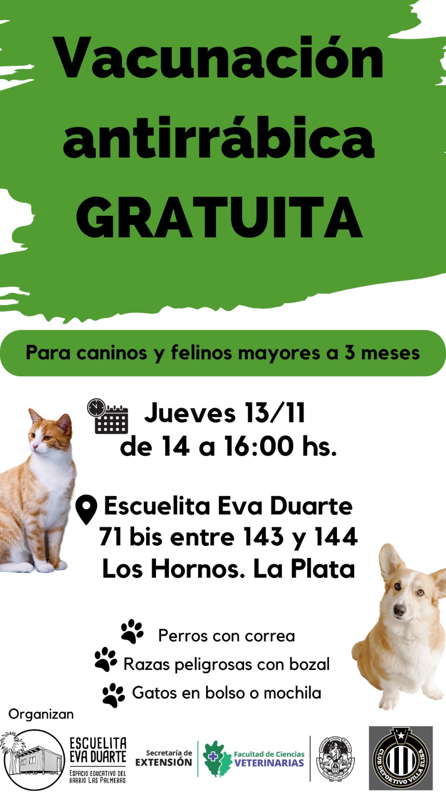 La vacunación se desarrollará por orden de llegada de 14 a 16 hs y quienes asistan deberán llevar a sus perros con correa, razas peligrosas con bozal y gatos en bolso o mochila.