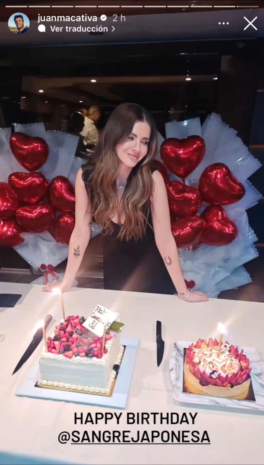Mientras el yate recorría lugares emblemáticos de Estambul, la China Suárez sopló las velitas dispuestas en dos tortas de distintos estilos. Una de ellas llevaba la inscripción: “Feliz cumpleaños 34”.
