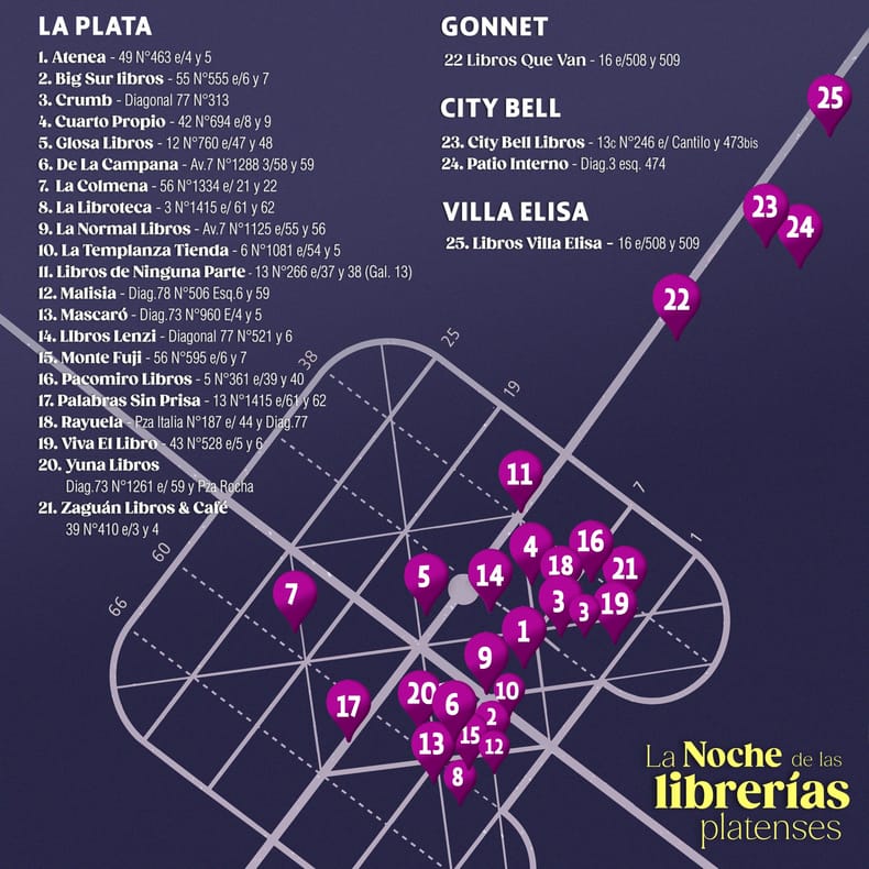 En esta quinta edición del evento participarán las librerías Atenea, Big Sur Libros, City Bell Libros, Crumb, Cuarto Propio, Glosa Libros, De La Campana, La Colmena, La Libroteca, La Normal Libros, La Templanza Tienda, Libros de Ninguna Parte, Libros que Van, Libros Lenzi, Libros Villa Elisa, Malisia, Mascaró, Monte Fuji, Pacomiro Libros, Palabras sin Prisa, Patio Interno, Rayuela, Viva el Libro, Yuna Libros y Zaguán Libros & Café.
