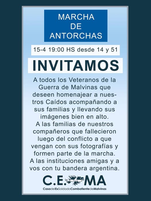 La convocatoria fue impulsada por la Casa del Ex Soldado Combatiente de Malvinas (CEMA) e invita a participar a veteranos, familiares y a la comunidad en general para rendir homenaje a quienes combatieron y a los caídos en la Guerra de Malvinas.
