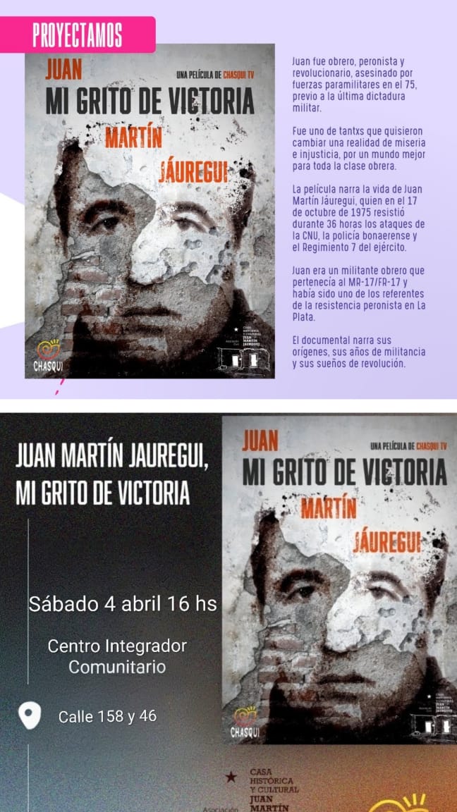 El encuentro tendrá lugar en 158 y 46 donde proyectarán el material audiovisual de @chasqui.tv y una muestra fotográfica a cargo del colectivo @activarfotos, que presentará registros de distintas actividades. La iniciativa cuenta con el acompañamiento del Centro Integrador Comunitario (CIC) de El Retiro, que facilitó el espacio para la realización de la jornada.