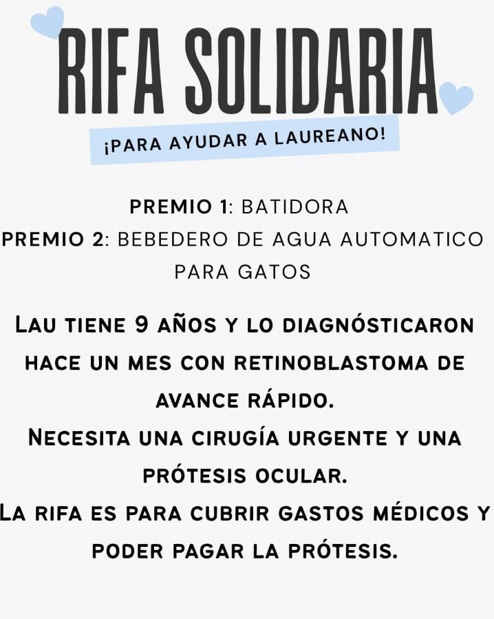 La familia de Laureano, un niño de 9 años diagnosticado recientemente con retinoblastoma de avance rápido, solicita la colaboración de la comunidad para poder reunir los fondos necesarios para la compra de una prótesis ocular, indispensable para su recuperación y para que pueda retomar su vida cotidiana y escolar.