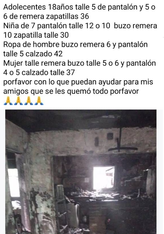 En ese marco, amigos y allegados de las victimas están necesitando indumentaria y calzado (remeras, buzos, zapatillas) para niña, adolescentes, un hombre y una mujer.