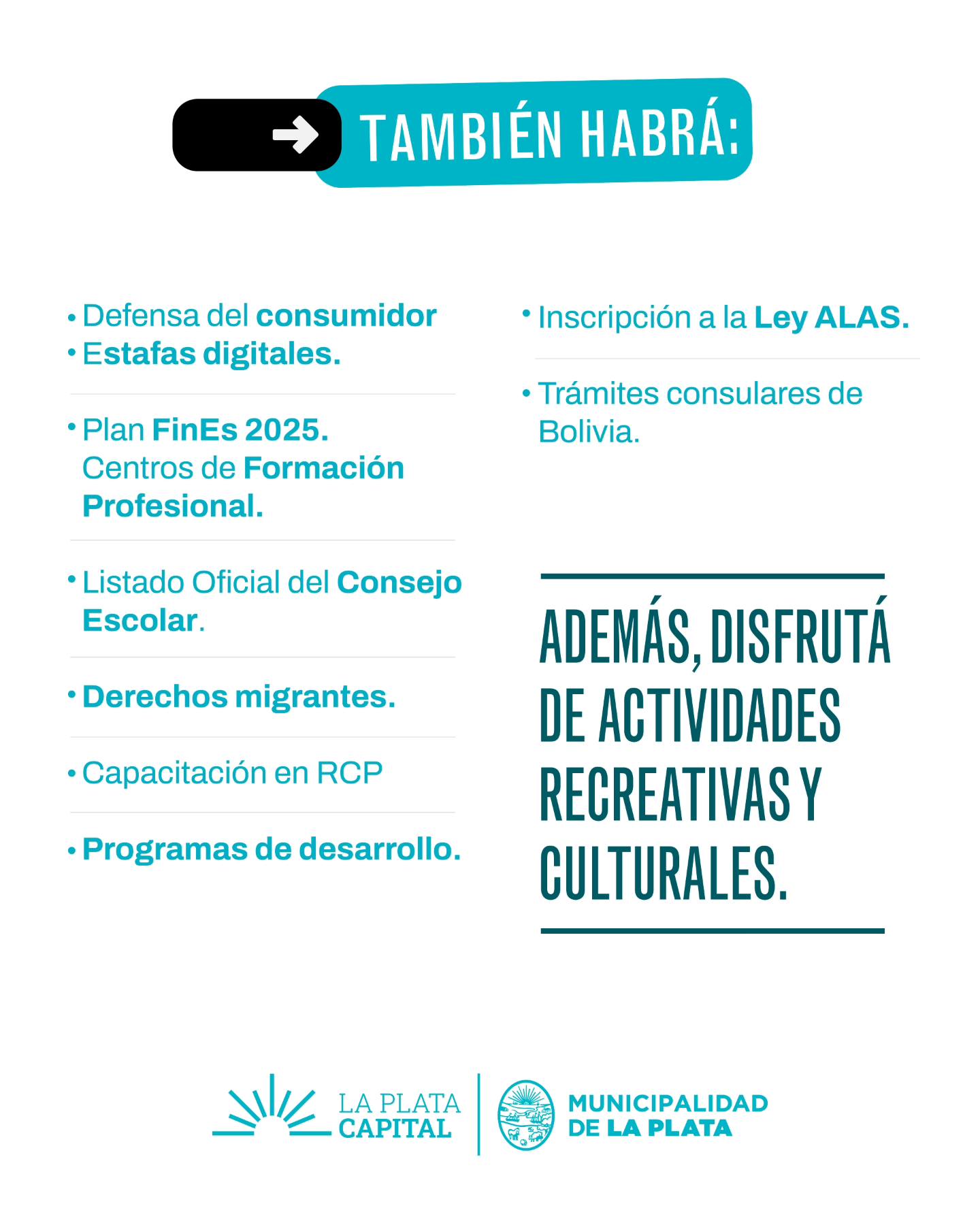 Además habrá asesoramiento y escucha en casos de violencia de género, promoción del reciclado y entrega de bolsas verdes, Información y asesoramiento sobre personería jurídica, orientación vocacional y acompañamiento educativo, asistencia para crear y mejorar el currículum y mucho más.
