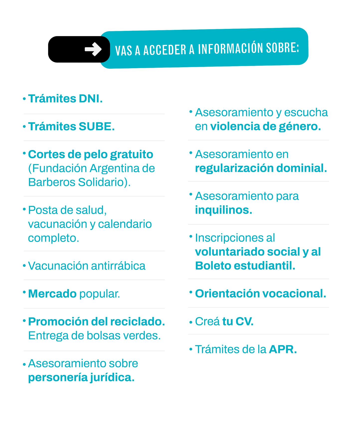 Durante ambas jornadas, los vecinos podrán acceder a gestiones clave y servicios comunitarios. Entre las propuestas, habrá: Trámites de DNI, gestión y consultas sobre la tarjeta SUBE, cortes de pelo gratuitos, vacunación antirrábica para mascotas, posta de salud con controles y orientación, mercado popular con productos a precios accesibles.