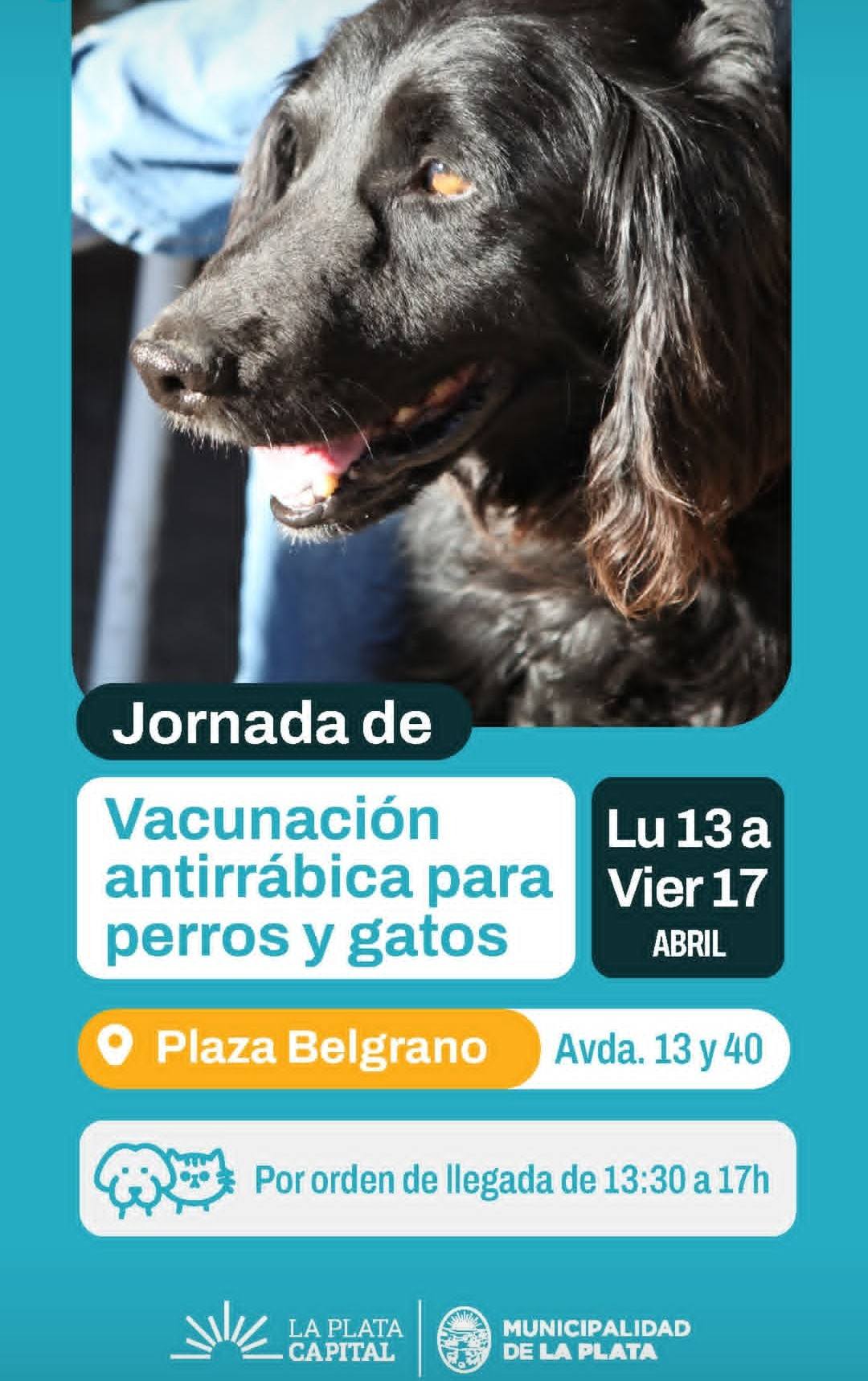 En ese marco, del lunes 13 al viernes 17 de abril se desarrollará una jornada en Plaza Belgrano ubicada en Av. 13 y 40, donde se aplicarán vacunas antirrábicas a perros y gatos por orden de llegada, en el horario de 13:30 a 17hs.