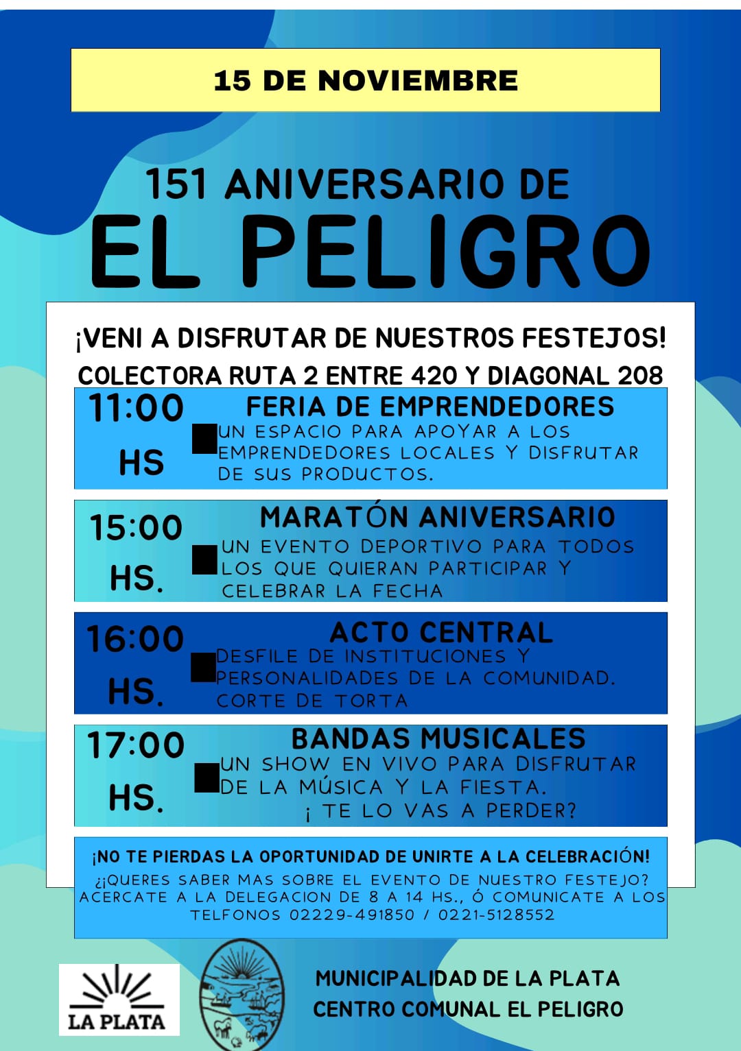 Este lunes 10 de noviembre se conmemora el 151° aniversario de El Peligro, y para celebrarlo, la comunidad realizará una gran jornada festiva el sábado 15 de noviembre en donde los vecinos, instituciones y emprendedores se reunirán para compartir actividades y espectáculos.