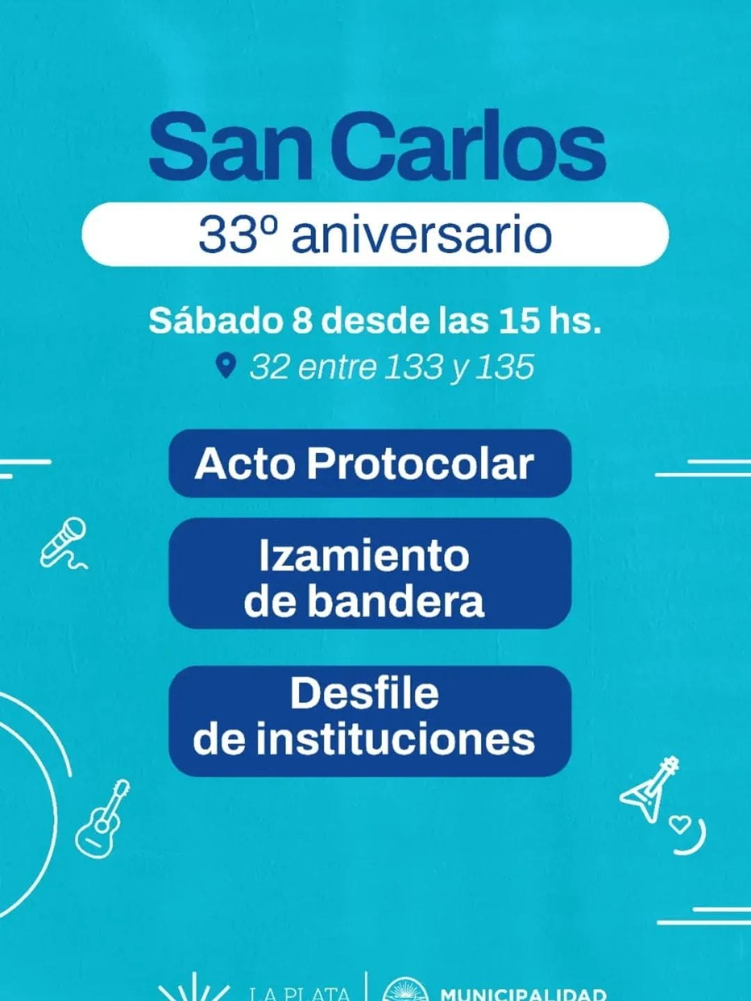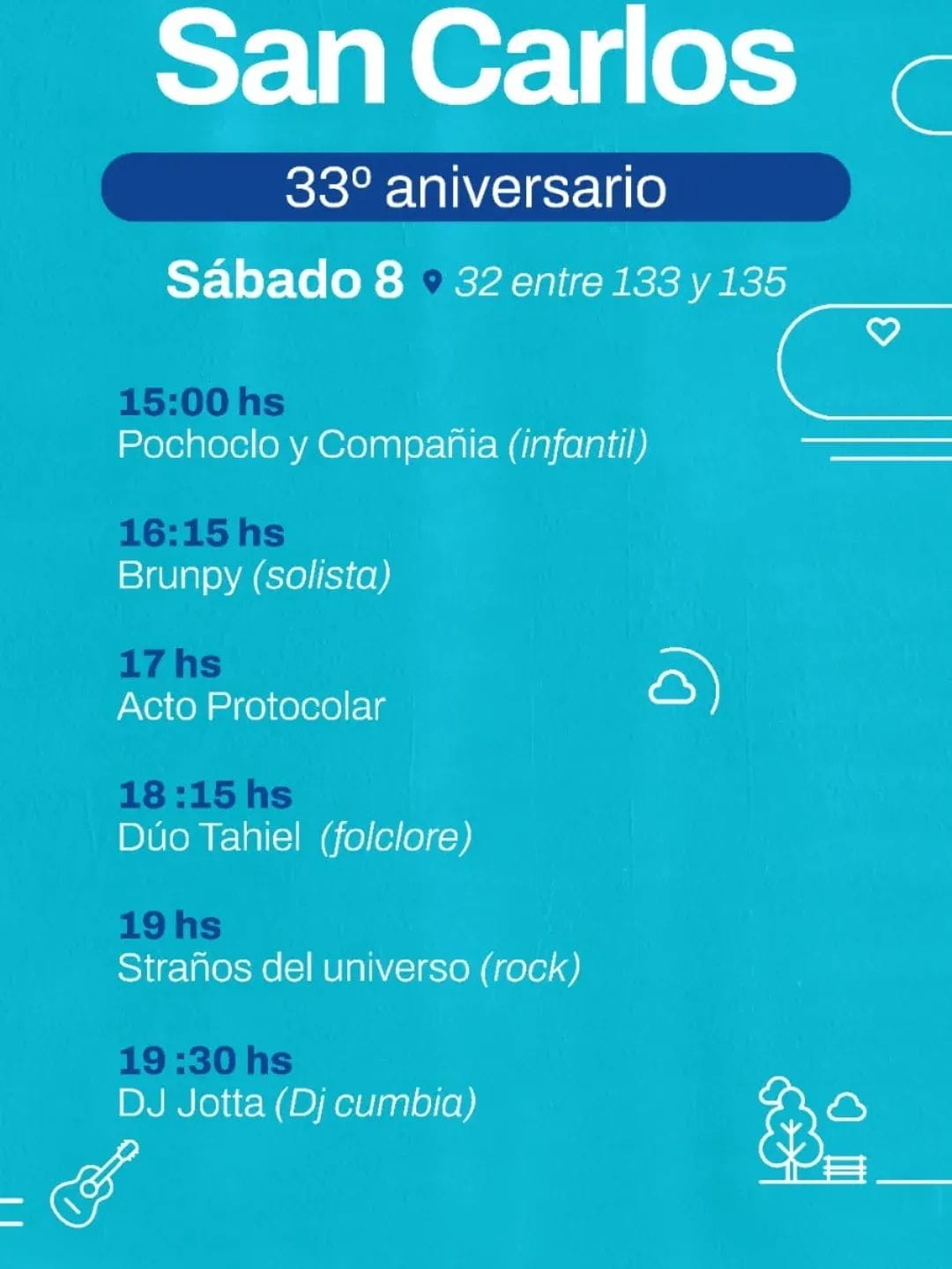 Este sábado 8 de noviembre, San Carlos se prepara para festejar su 33° aniversario con una jornada con propuestas artísticas y actividades para toda la familia. El evento tendrá lugar en 32 entre 133 y 135, desde las 15 hs, con entrada libre y gratuita.