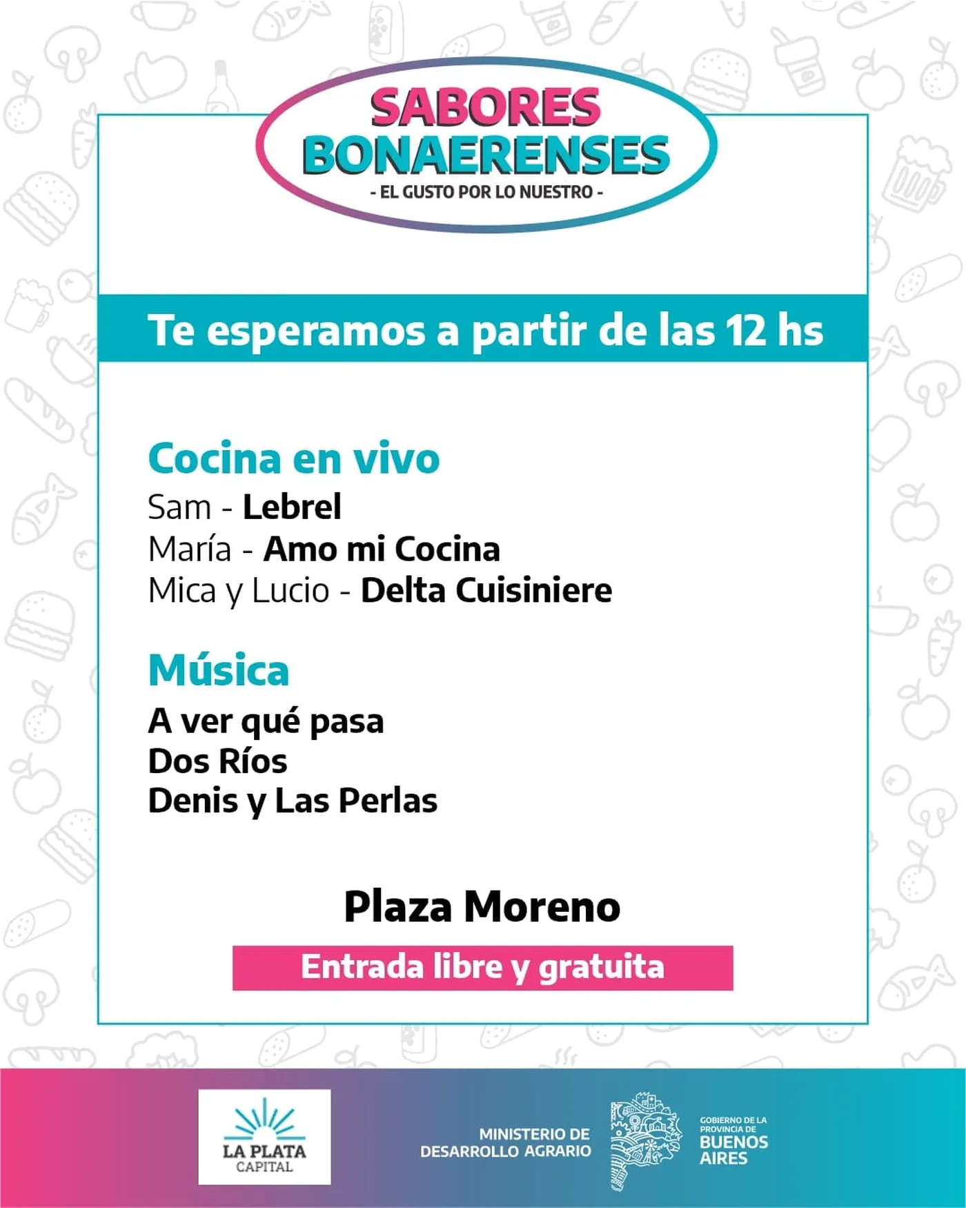 Este sábado 4 de octubre, se realizará la feria gastronómica “Sabores Bonaerenses” en Plaza Moreno con entrada libre y gratuita. Se trata de un evento que reúne shows de cocina y música en vivo, entre otras atracciones.