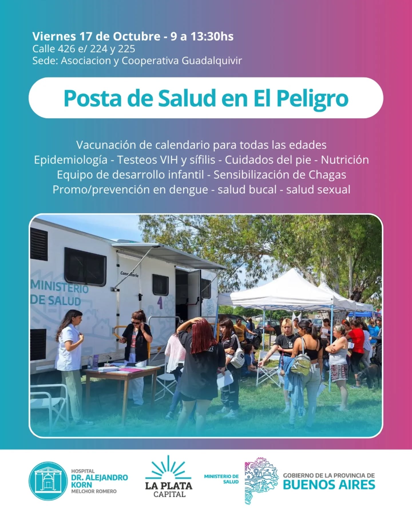 El próximo viernes 17 de octubre, de 9 a 13:30 hs, se realizará una nueva Posta de Salud en El Peligro, con servicios gratuitos para toda la comunidad. La actividad tendrá lugar en la Asociación y Cooperativa Guadalquivir, ubicada en Calle 426 entre 224 y 225.