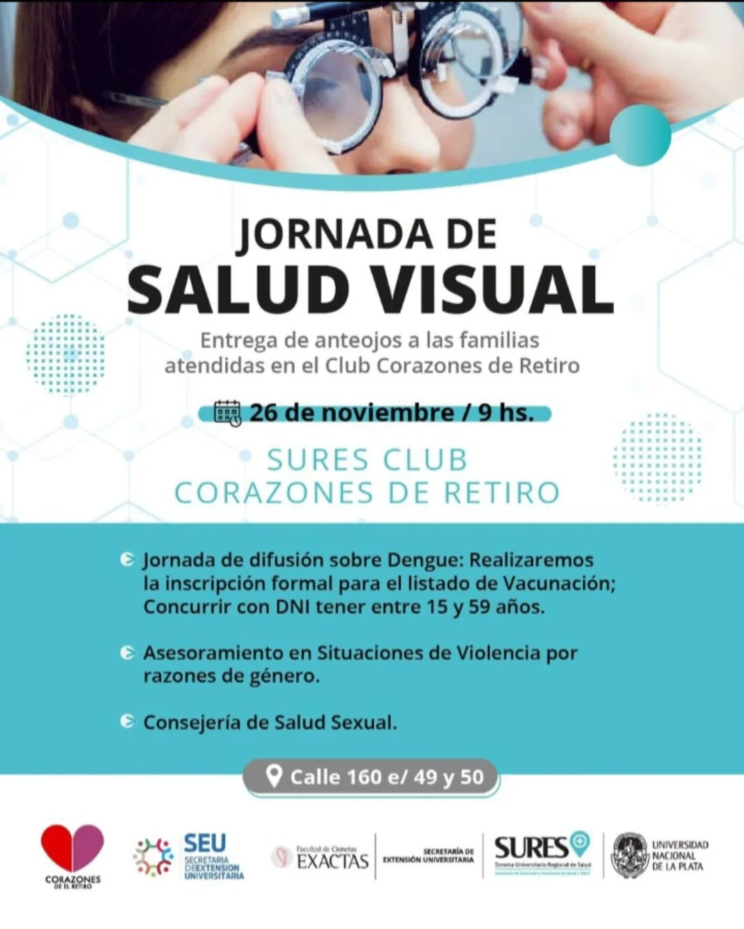 El próximo 26 de noviembre a las 9hs, el Club Corazones de Retiro ubicado en 160 entre 49 y 50, será sede de una jornada de salud visual y atención comunitaria destinada a familias del barrio. Durante el encuentro, se llevará adelante la entrega de anteojos a los vecinos previamente atendidos en el espacio.