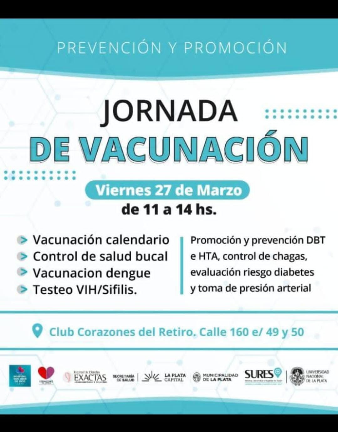 El viernes 27 de marzo se realizará una jornada de vacunación en el Club Corazones del Retiro, ubicado en calle 160 entre 49 y 50. La actividad será de 11 a 14hs y está abierta a toda la comunidad y busca facilitar el acceso a vacunas y controles de salud de manera gratuita.