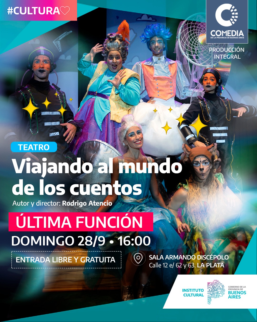 Este domingo 28 de septiembre a las 16 hs en la Sala Armando Discépolo ubicada en calle 12 entre 62 y 63, será escenario de la última función de “Viajando al Mundo de los Cuentos”.