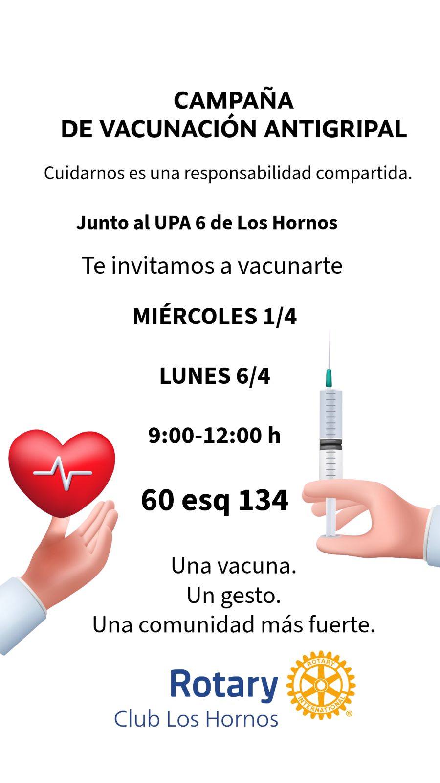 La iniciativa es impulsada por el Rotary Club Los Hornos en conjunto con el UPA N°6 de Los Hornos y busca facilitar el acceso a la vacuna contra la gripe para vecinos y vecinas de la zona.