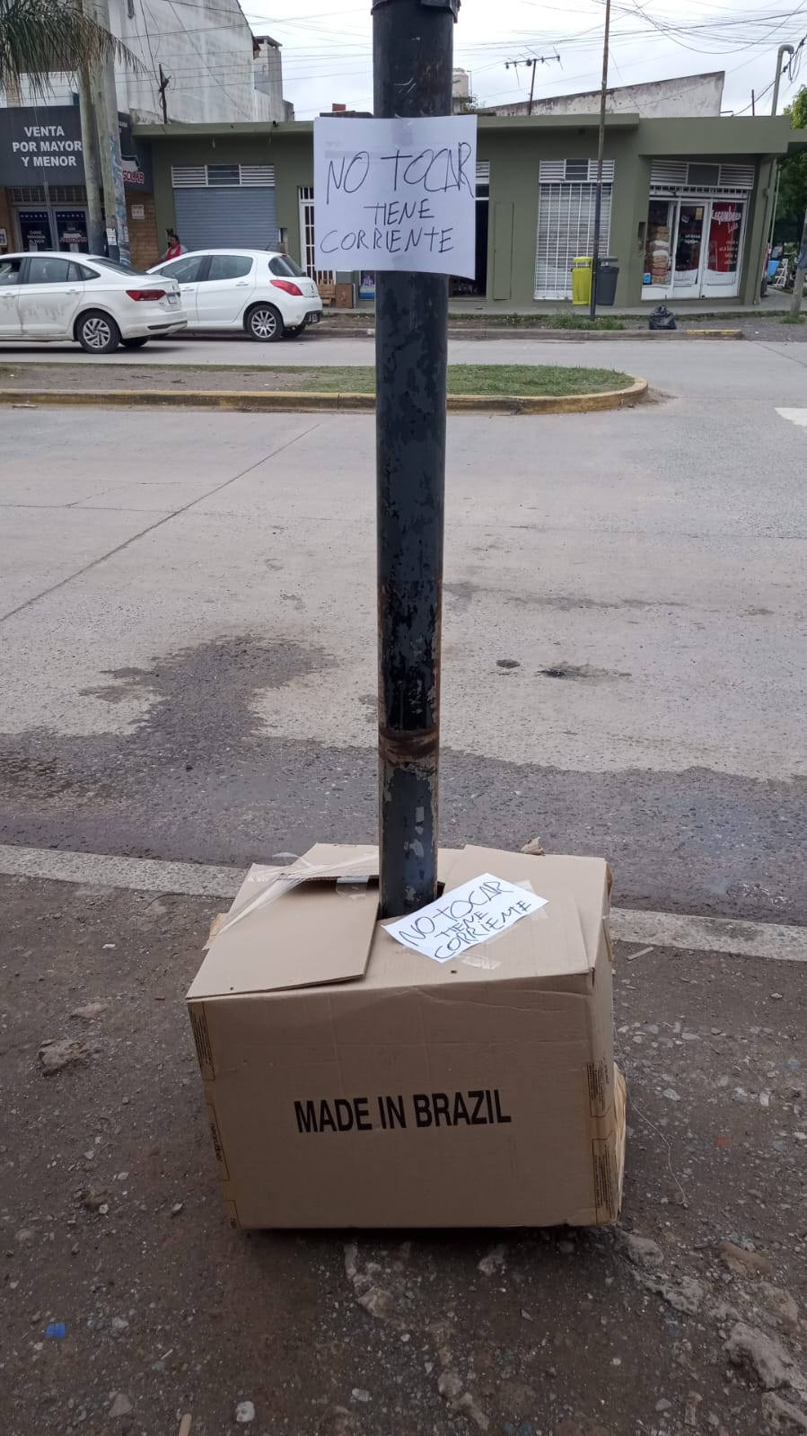 “No tocar, tiene corriente”, advierten en un cartel que colocaron los propios usuarios en el poste ubicado sobre la parada de micros. También, pusieron una caja en la base para que ningún animal se acerque a la columna.