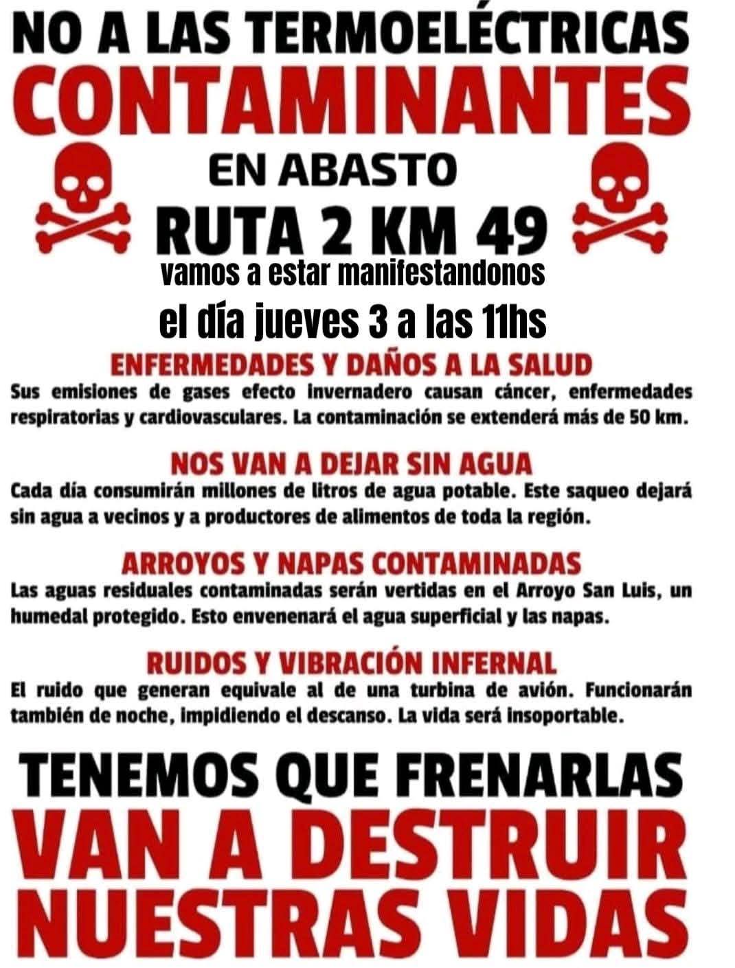 Este jueves 3 de abril habrá una manifestación vecinal en rechazo a la instalación de una central termoeléctrica sobre la Ruta 2, Km 49. La empresa SCC Power, responsable de la central, tuvo que cerrar una planta que tiene en Pilar, tras múltiples reclamos de vecinos y ambientalistas por ser altamente contaminante y probarse casos graves de enfermedades.